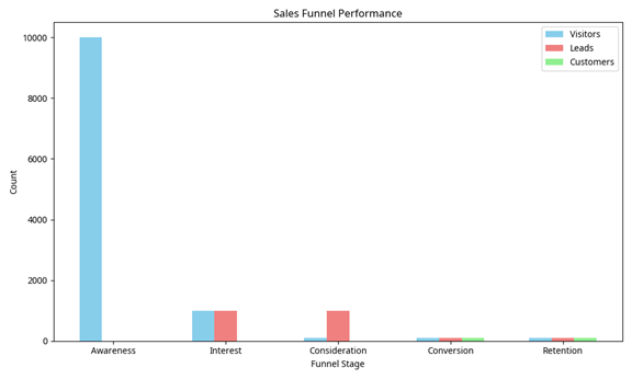 Below, the Sales Funnel Performance bar chart illustrates the typical drop-off rates as prospects move through the funnel stages. Understanding these numbers is crucial for identifying bottlenecks and optimizing each step.